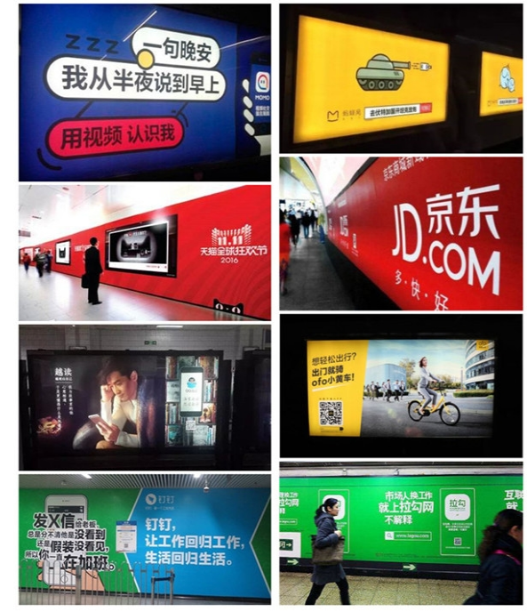 簡(jiǎn)單配色、重復(fù)表達(dá)。網(wǎng)易云音樂、知乎、陌陌、美團(tuán)、京東都用,產(chǎn)品代表色來進(jìn)行地鐵刷屏,長(zhǎng)時(shí)間內(nèi)大量重復(fù),可以讓人將品牌與顏色畫上等號(hào),進(jìn)而達(dá)到占領(lǐng)消費(fèi)者心智的目的。